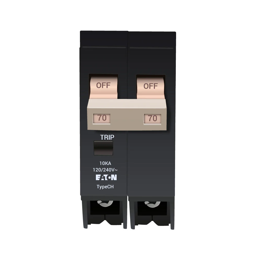 Eaton / Cutler-Hammer Plug-On Circuit Breaker Its Compact And Easy to Install two pole circuit breaker features thermal magnetic molded case for extra protection circuit breaker has a current rating of 70 amps and voltage rating of 120/240 VAC it is a common trip breaker that has AIC rating of 10000 amps and accommodates copper/aluminum wire of size 14 to 2 AWG circuit breaker is Ul 489 listed and Csa certified.