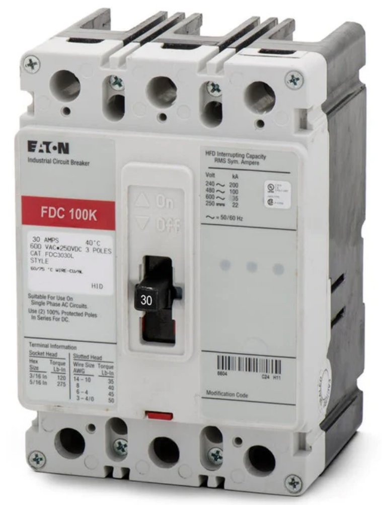 The Eaton FDC3030 is a 3 Pole thermal magnetic molded case circuit breaker with a current rating of 30 Amps and a voltage rating of 600V. It has an interrupting rating of 100kA@480V. The FDC3030 has a bolt-on connection type and includes LI – long time and instantaneous functions.