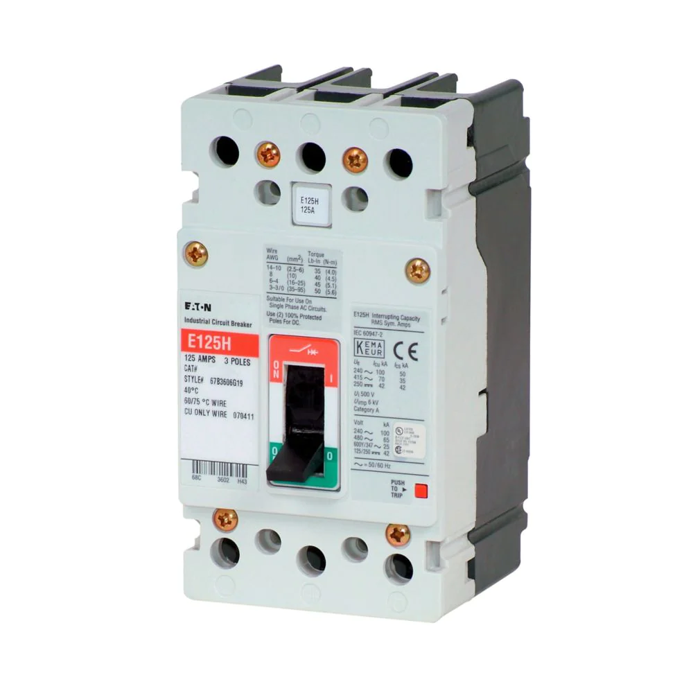 The Eaton EGH3090FFB is a 3 Pole thermal magnetic molded case circuit breaker with a current rating of 90 Amps and a voltage rating of 600Y/347VAC. It has an interrupting rating of 65kAIC at 480VAC, 35kAIC at 600Y/347VAC, 100kAIC at 240VAC. The EGH3090FFB has a bolt-on connection type and includes LI – long time and instantaneous functions.