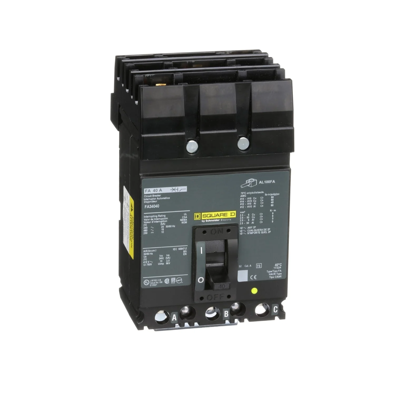 Schneider Electric / Square D Circuit Breaker Its Compact And Easy to Install FA three poles molded case circuit breaker has F-frame it provides thermal magnetic protection circuit breaker has a current rating of 30 amps a voltage rating of 480 Vac/250 Vdc at 50/60 Hz and a trip rating of 275 – 600 amps circuit breaker has interrupting rate of 18 kilo-Amps at 480 Vac it can accommodate copper wires of size 14 – 4 Awg and aluminum wires of size 12 – 4 Awg.