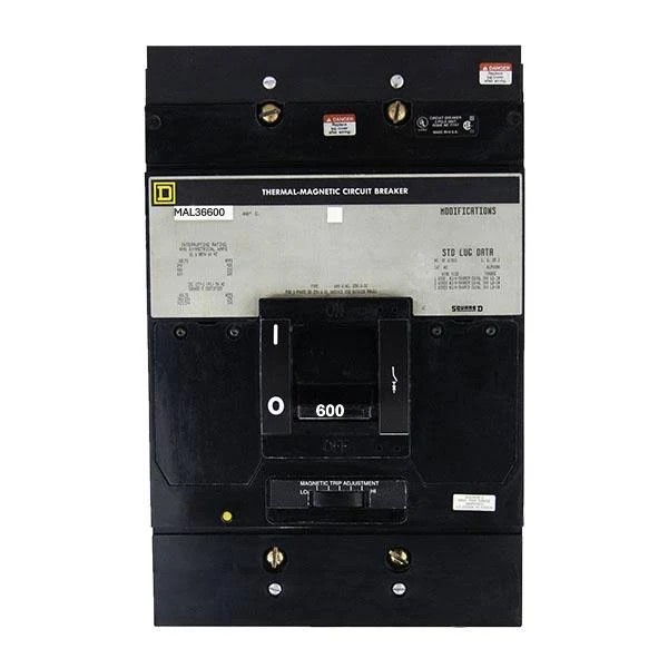 The Square D MAL36600 is a Molded Case circuit breaker. This type MAL circuit breaker is a member of The MAL series family. The MAL36600 is a 3 pole, 600 Volt, 600 amp rated circuit breaker, with an AIC rating of 30kA@480V and is manufactured by Square D. The MAL36600 uses a feed-thru connection and includes thermal magnetic protection. The trip unit features LI - Long-Time and Instantaneous functions.