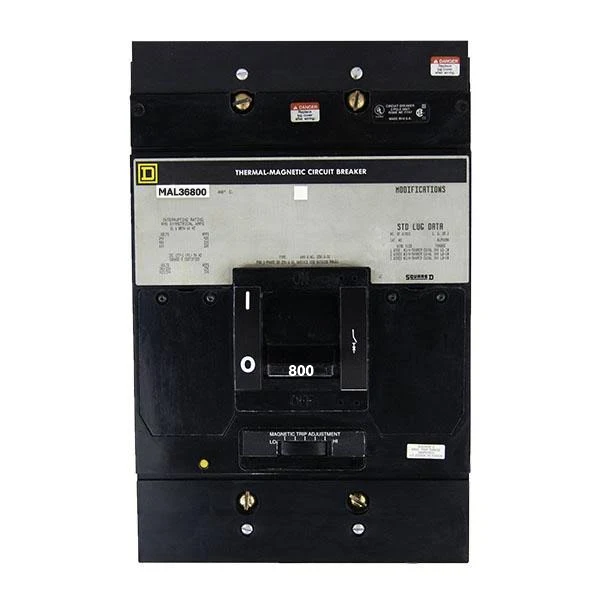 The Square D MAL36800 is a Molded Case circuit breaker. This type MAL circuit breaker is a member of The MAL series family. The MAL36800 is a 3 pole, 600 Volt, 800 amp rated circuit breaker, with an AIC rating of 30kA@480V and is manufactured by Square D. The MAL36800 uses a feed-thru connection and includes thermal magnetic protection. The trip unit features LI - Long-Time and Instantaneous functions