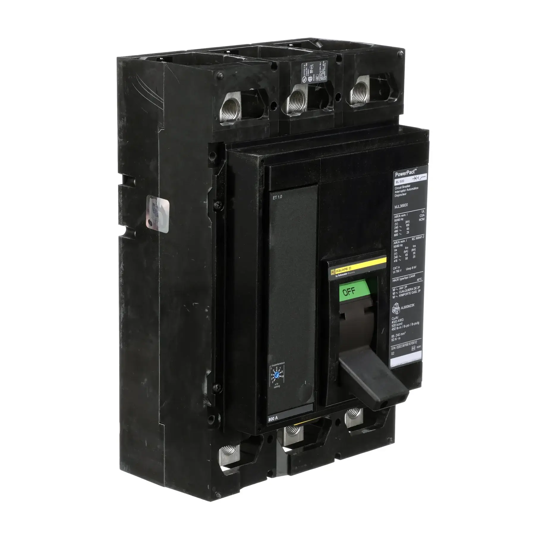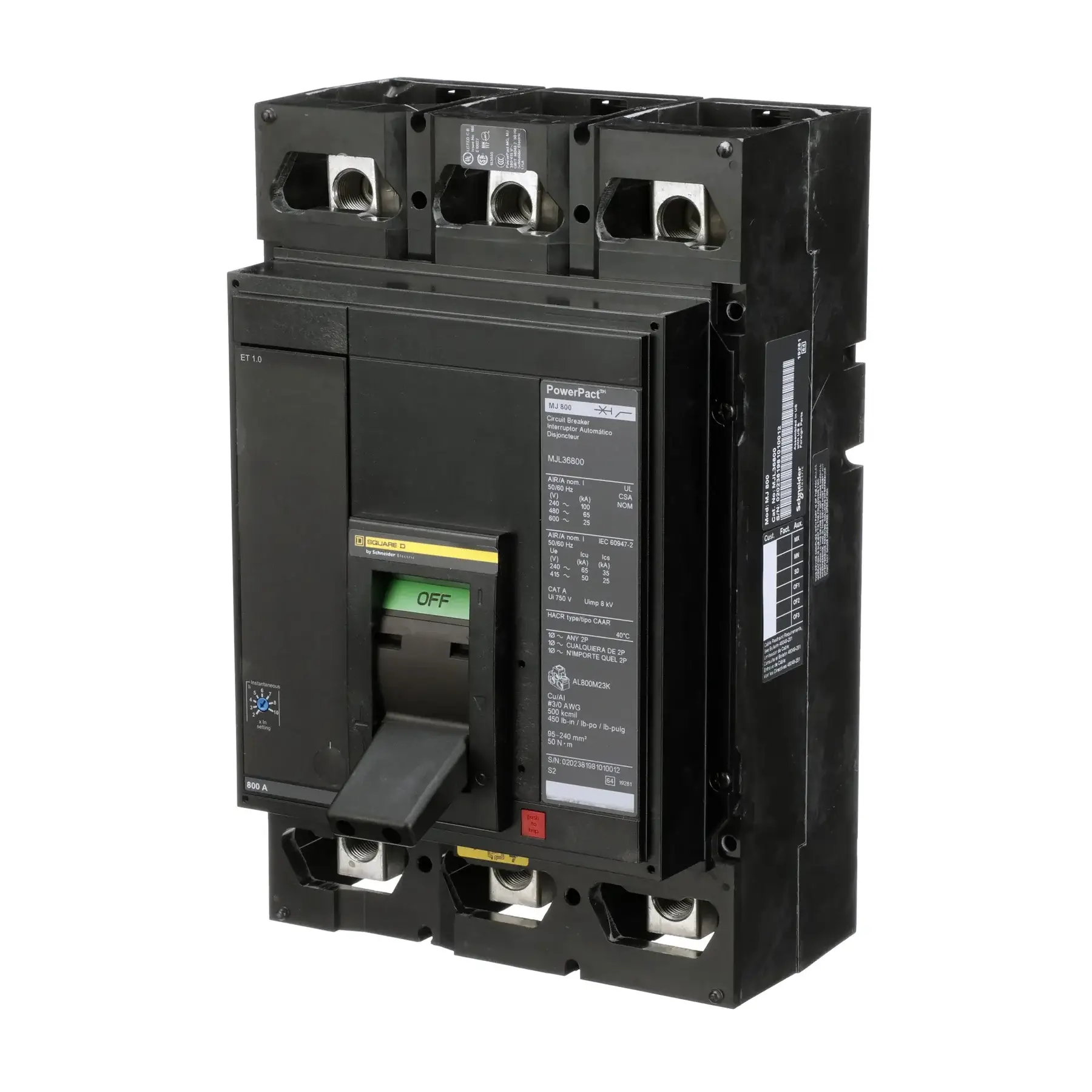 The Square D MJL36800 is a 3 Pole thermal magnetic molded case circuit breaker with a current rating of 800 Amps and a voltage rating of 600VAC. It has an interrupting rating of 100kA at 240VAC, 65kA at 277/480VAC, 25kA at 347/600VAC. The MJL36800 features with M frame type and comes with 3 phase connection.