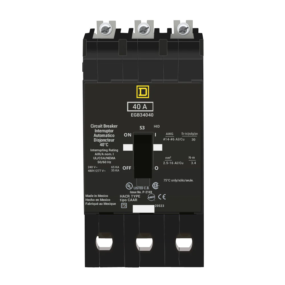 Schneider Electric / Square D Bolt-On Circuit Breaker Its Compact And Easy to Install Three poles thermal-magnetic circuit breaker has a current rating of 40 Amps at 40 deg c and voltage rating of 120/240/277 Vac it has an interrupt current rating of 65 Kiloampere At 120/240 Vac it accommodates aluminum/copper wire of size 14 to 2/0 Awg miniature circuit breaker has mounting bolts to hold the breaker in place circuit breaker is Ul listed and Csa certified.