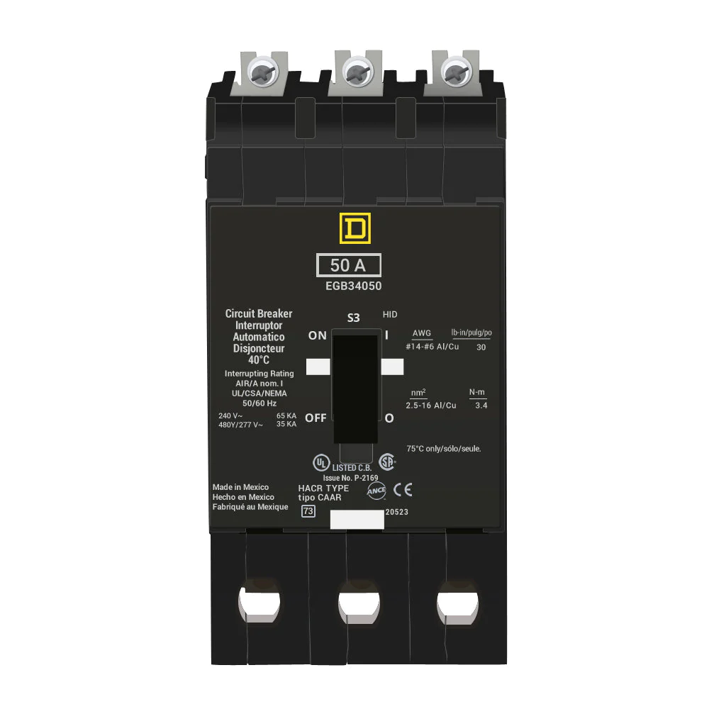 Schneider Electric / Square D Bolt-On Circuit Breaker Its Compact And Easy to Install Three poles thermal-magnetic circuit breaker has a current rating of 50 Amps at 40 deg c and voltage rating of 120/240/277 Vac it has an interrupt current rating of 65 Kiloampere At 120/240 Vac it accommodates aluminum/copper wire of size 14 to 2/0 Awg miniature circuit breaker has mounting bolts to hold the breaker in place circuit breaker is Ul listed and Csa certified.