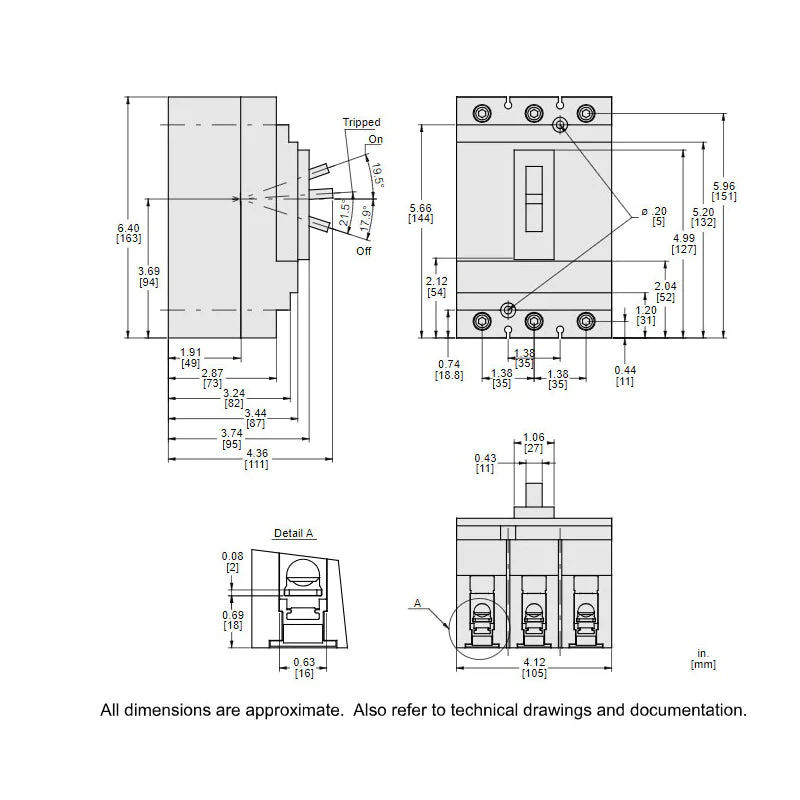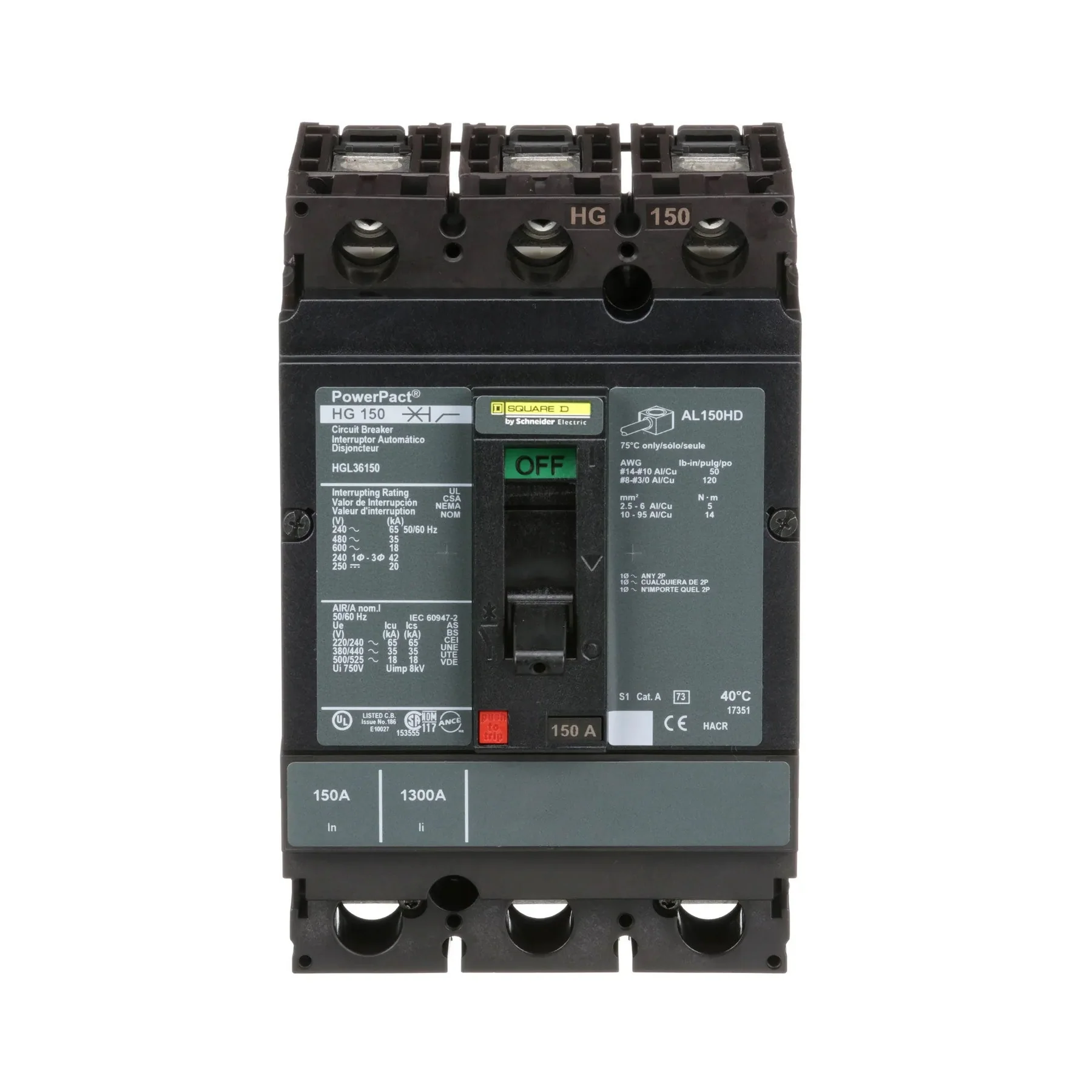 THERMAL MAGNETIC CURRENT LIMITING TYPE 4.09 INCH WIDTH X 3.39 INCH DEPTH X 6.42 INCH HEIGHT SIZE 600 VOLT MAX. AC VOLTAGE RATING 250 VOLT MAX. DC VOLTAGE RATING UL CSA CE APPROVAL 600 VOLT AC 50/60 HERTZ 250 VOLT DC VOLTAGE RATING 18 KILOAMP AT 600 VOLT AC 20 KILOAMP AT 250 VOLT DC INTERRUPTING RATING 150 AMP CURRENT RATING 3 POLE(S) LINE/LOAD LUG TERMINAL TYPE H FRAME TYPE POWERPACT[TM] BRAND ROHS/REACH COMPLIANT TRIP SETTING 900 AMP (HOLD) 1700 AMP (TRIP) MOUNTING TYPE UNIT CONTROL TYPE TOGGLE TERMINAL WIRE SIZE 14 TO 3/0 AWG (COPPER/ALUMINUM) CONTINUOUS CURRENT RATING 80 PERCENT OPERATION AMBIENT AIR TEMPERATURE RATING 28 TO 158 DEG F APPLICATION DISTRIBUTION APPLICABLE STANDARD NOM 003 NEMA IEC 60947-2 HG MODEL