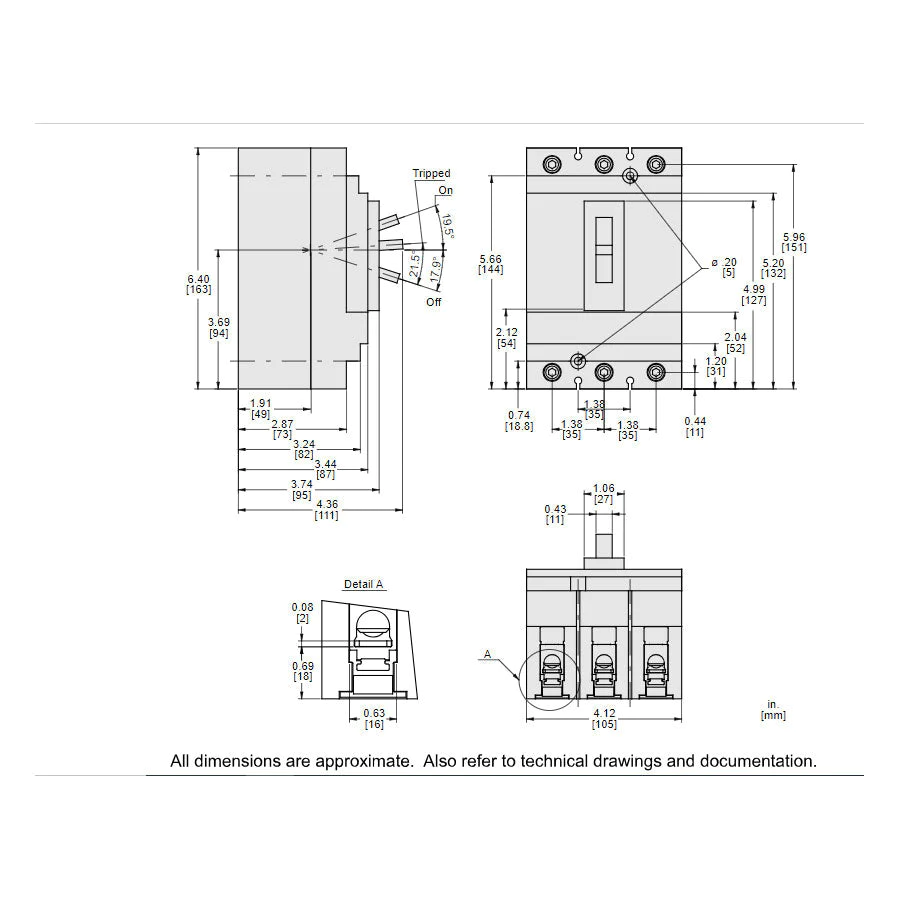 THERMAL MAGNETIC CURRENT LIMITING TYPE 4.09 INCH WIDTH X 3.39 INCH DEPTH X 6.42 INCH HEIGHT SIZE 600 VOLT MAX. AC VOLTAGE RATING 250 VOLT MAX. DC VOLTAGE RATING UL CSA CE APPROVAL 600 VOLT AC 50/60 HERTZ 250 VOLT DC VOLTAGE RATING 25 KILOAMP AT 600 VOLT AC 20 KILOAMP AT 250 VOLT DC INTERRUPTING RATING 100 AMP CURRENT RATING 3 POLE(S) LINE/LOAD LUG TERMINAL TYPE H FRAME TYPE POWERPACT[TM] BRAND ROHS/REACH COMPLIANT TRIP SETTING 800 AMP (HOLD) 1700 AMP (TRIP) MOUNTING TYPE UNIT CONTROL TYPE TOGGLE TERMINAL WIRE SIZE 14 TO 3/0 AWG (COPPER/ALUMINUM) CONTINUOUS CURRENT RATING 80 PERCENT OPERATION AMBIENT AIR TEMPERATURE RATING 28 TO 158 DEG F APPLICATION DISTRIBUTION APPLICABLE STANDARD NOM 003 NEMA IEC 60947-2 HJ MODEL