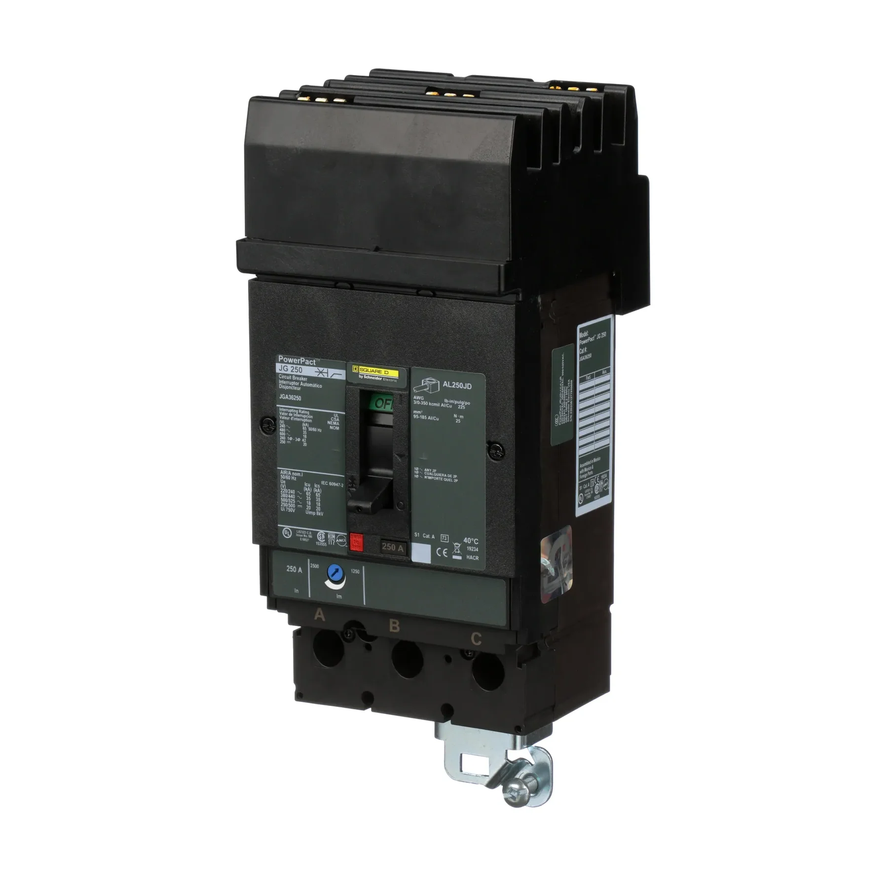 JGA36250 is a J frame 3 pole 250 Ampere powerpact standard molded case circuit breaker with maximum voltage rating of 240/415 Vac At 50/60 Hz comes with adjustable magnetic trips 1250 To 2500 ampere general application power distribution used on class 612 i-line[R] panelboard/switchboard.