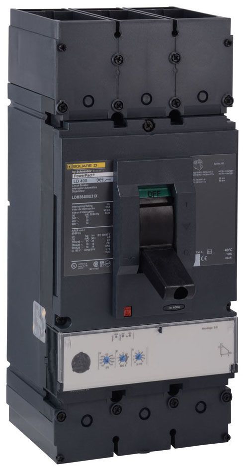 The Square D LJM36400U31X is a 3 Pole solid state molded case circuit breaker with a current rating of 400 Amps and a voltage rating of 600VAC. It has an interrupting rating of 65kA@480V. The LJM36400U31X has a unit mounting type and includes LI - long time and instantaneous functions.