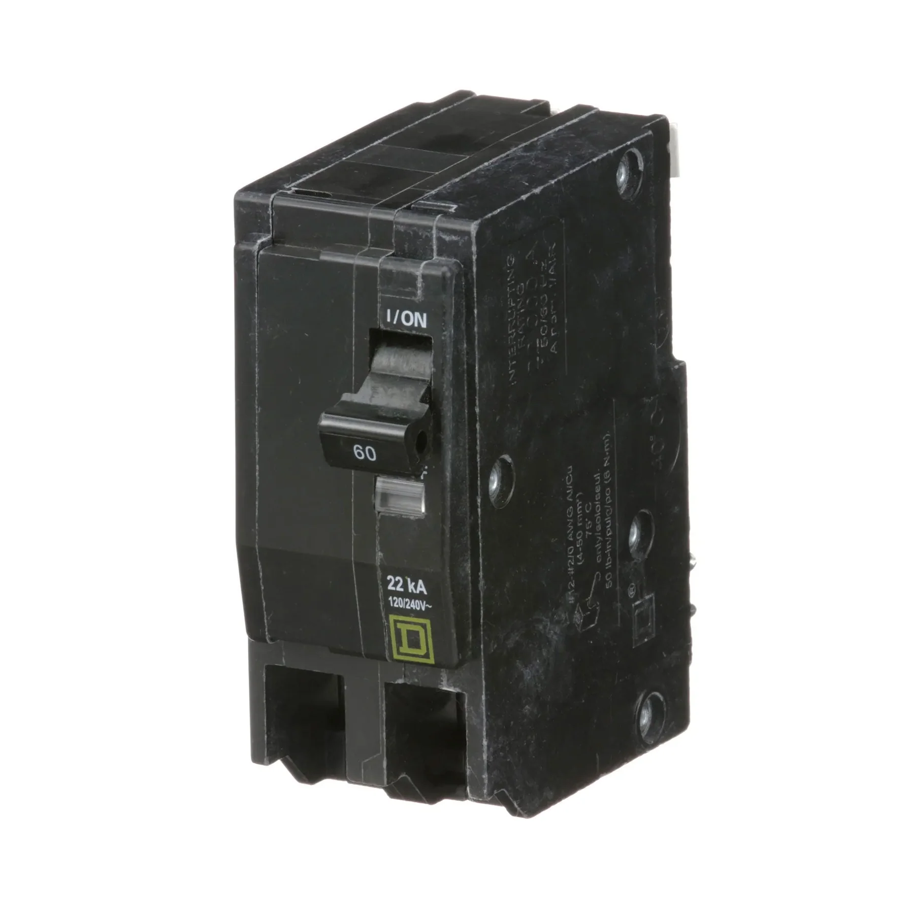 COMMON TRIP MINIATURE STANDARD TYPE 1.5 INCH WIDTH X 2.91 INCH DEPTH X 3.11 INCH HEIGHT SIZE QO LOAD CENTER NQ/NQOD PANELBOARD/OEM INTERIOR/SPEED-D SWITCHBOARD DISTRIBUTION PANEL USED ON 8 TO 2 AWG (COPPER/ALUMINUM) WIRE SIZE UL CSA APPROVAL 120/240 VOLT AC 50/60 HERTZ VOLTAGE RATING PLUG-IN MOUNTING 22 KILOAMP INTERRUPTING RATING 60 AMP CURRENT RATING 2 POLE(S) BOX LUG TERMINAL TYPE QO[TM] HOMELINE[TM] BRAND ROHS/REACH COMPLIANT AMBIENT RATING 104 DEG F TIGHTENING TORQUE RATING 44.25 INCH-POUND QO MODEL