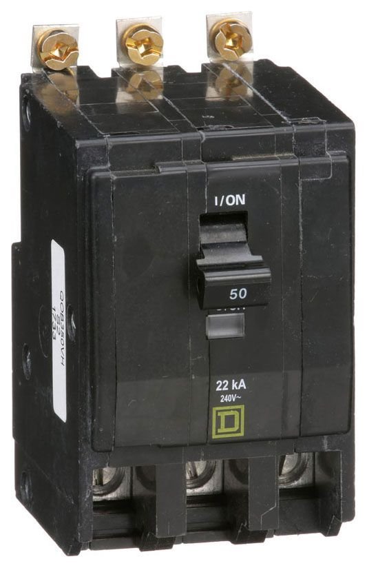 Square D bolt-on circuit breaker has a voltage rating of 120/240 Volts current rating of 50 Amps and interrupting rating of 22 kilo-Amps. The 3-Pole thermal magnetic circuit breaker features a lug terminal and accommodates aluminum/copper wire size of 8 – 2 AWG.