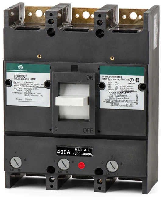 General Electric 3 poles Bolt-On molded case circuit breaker comes with the current rating of 400A and voltage rating of 600V. It features an interrupt rating of 30kA at 480V. It is complete with thermal magnetic protection and LI-Long-Time and Instantaneous functions.